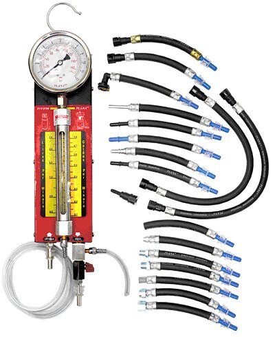 Equipo de prueba de presión y flujo simultáneo de la bomba eléctrica de combustible de vehículos con inyección electrónica.